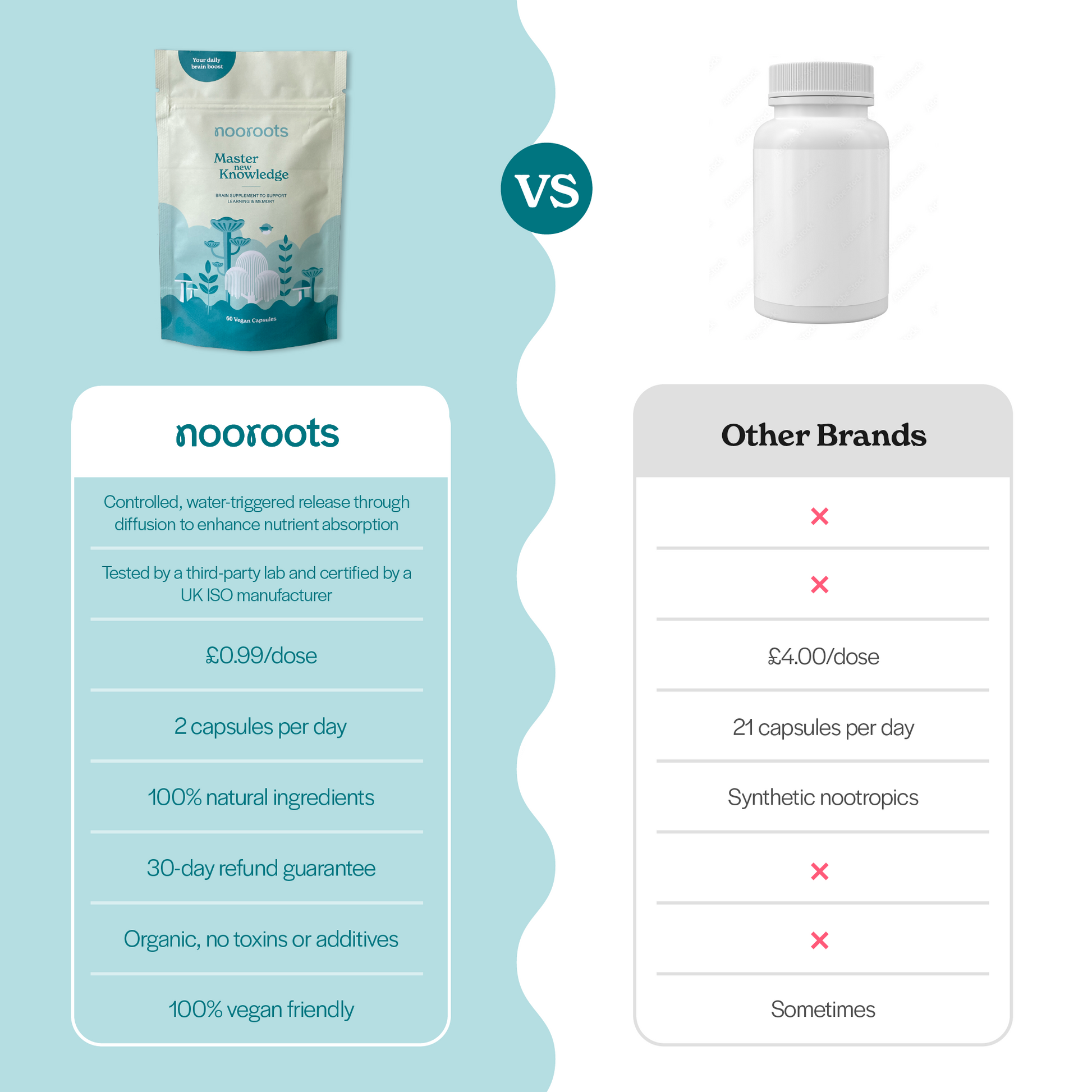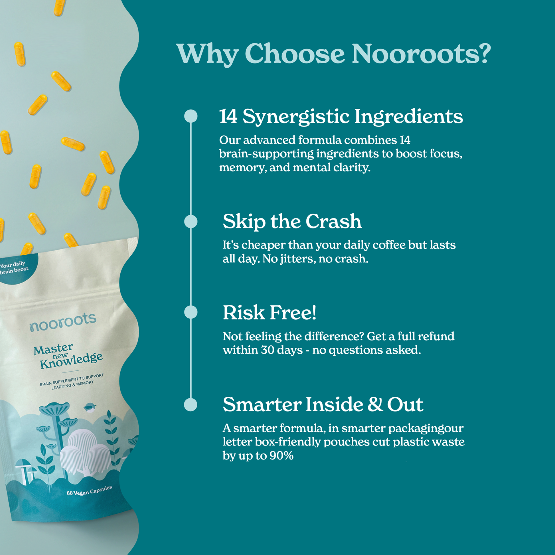 If nooroots’ nootropic supplements don’t meet your expectations, let us know within 30 days of purchase for a refund, minus shipping fees. We also appreciate any feedback to help us improve.